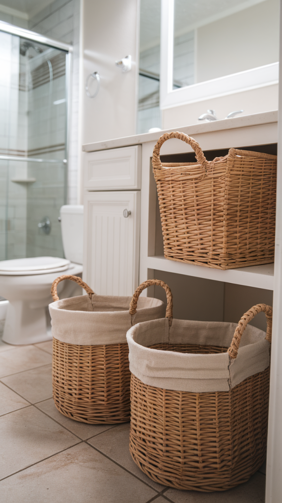 Baskets and bins offer flexible storage options that are both practical and decorative. They can be placed on shelves, countertops, or floors to add texture and style while keeping towels organized.
