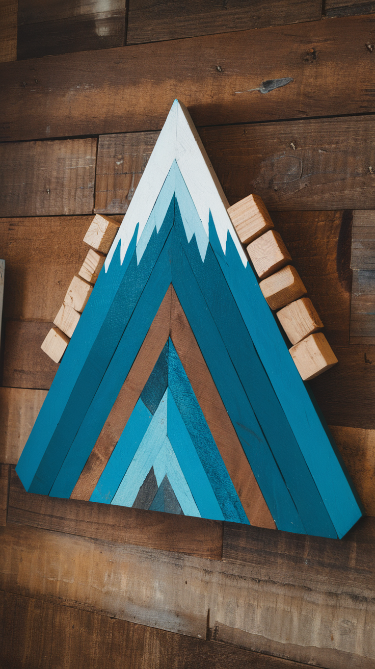 Purchase or find thin laths and cut the ends at 45-degree angles to form mountain peaks. Take some time to stain the different “peaks” in varying shades of brown and gray, and glue them to a plywood backing to create a scenic piece of scrap wood project decor that adds a relaxed, free-spirited vibe to your bedroom.