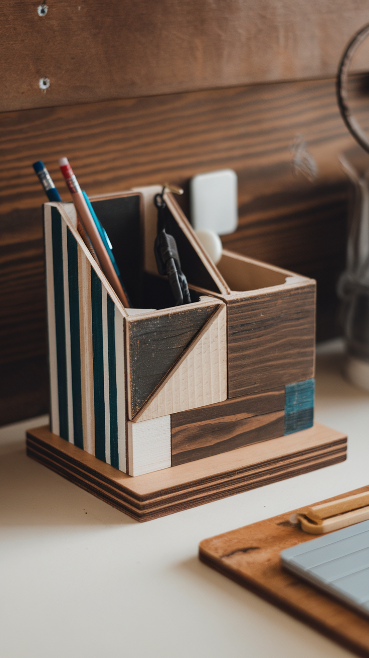 Source a solid block of scrap wood, take the time to drill various-sized holes for pens and a wider slot for your phone, and finish with a dark wax to create a nostalgic scrap wood project’s aesthetic that adds instant organization and historical interest to your desk.