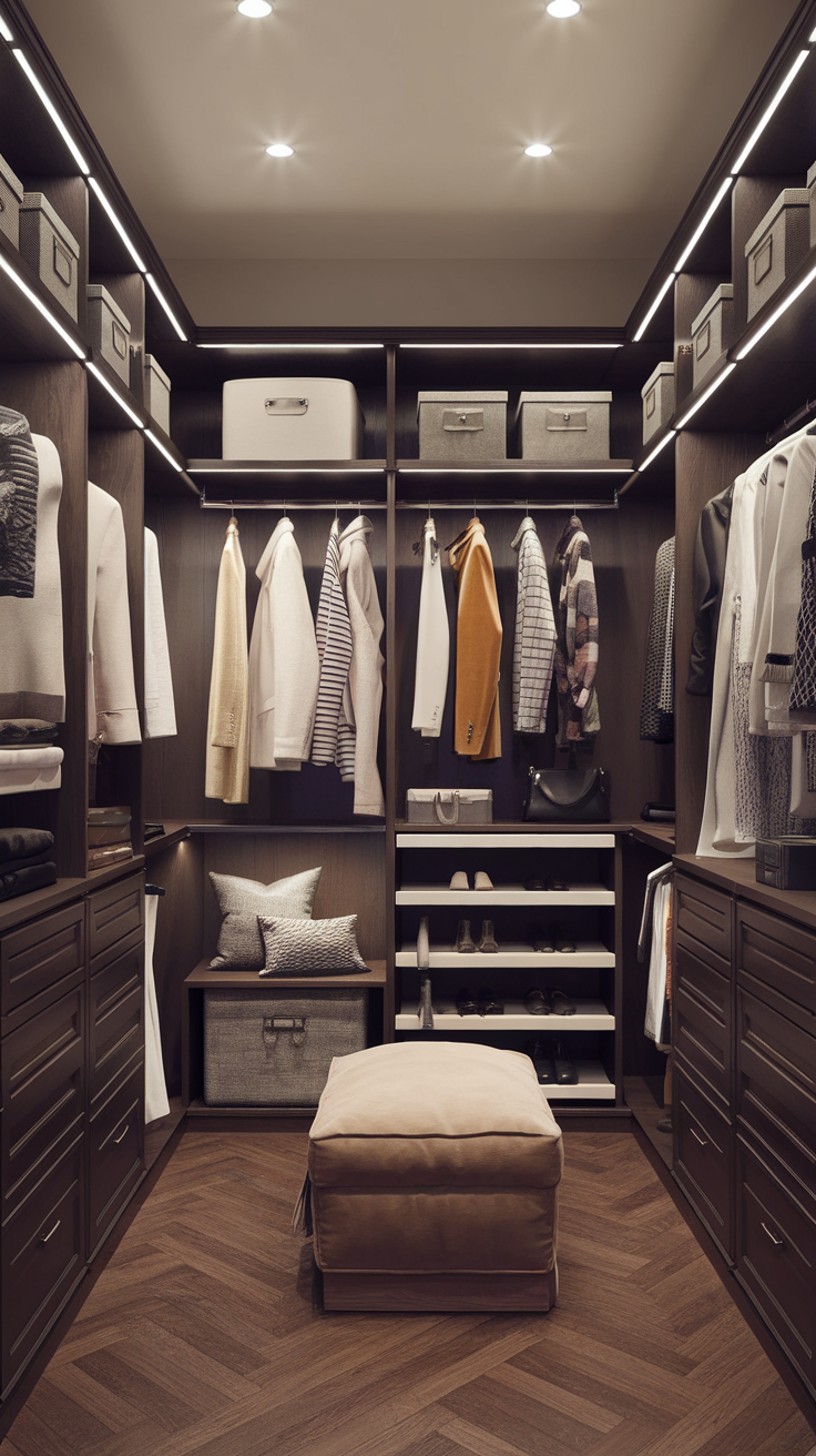 A small bench or ottoman in a walk-in closet offers a functional place to sit while dressing or putting on shoes, enhancing comfort and usability.