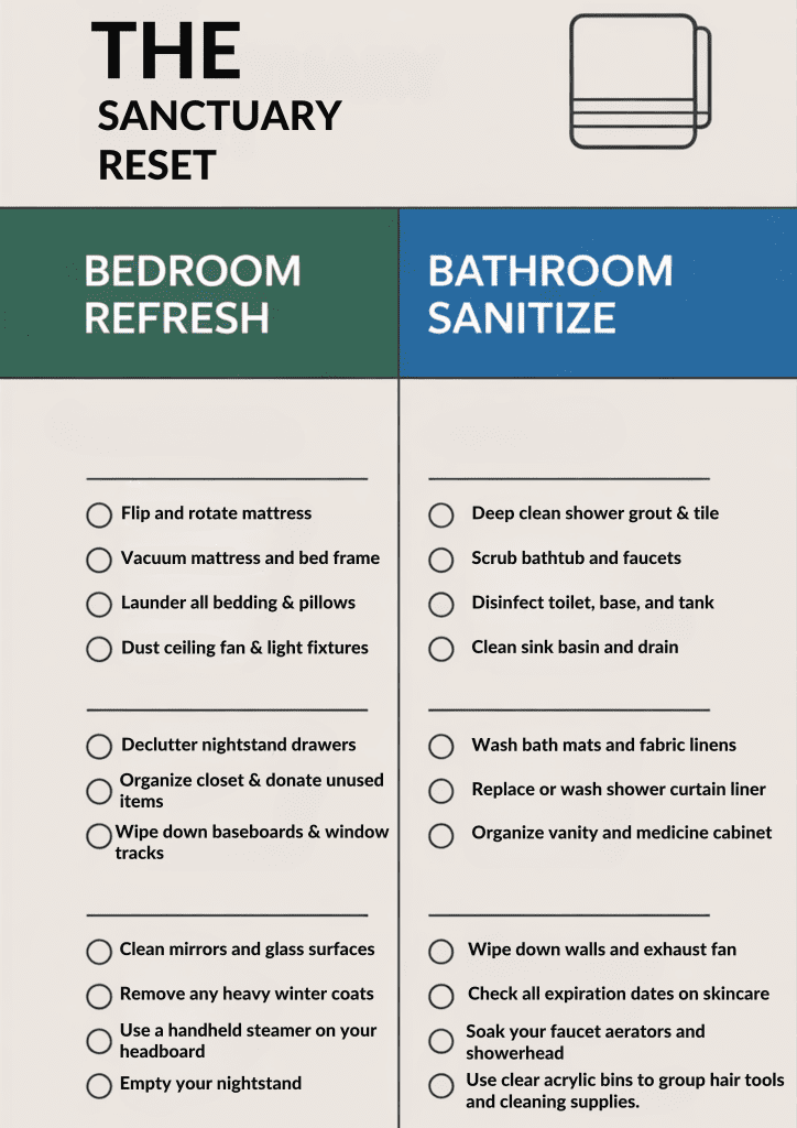 Every home has a unique footprint, and your tools should reflect that. If you prefer a digital-first approach, you can import the spring cleaning checklist into Canva to layer your specific room requirements—like a “Dark Academia” office or a minimalist guest suite directly onto the design. For the analog purist, the minimalist layout of this checklist is perfect for hand-written notes. Use the generous margins of your spring cleaning checklist to jot down specific cleaning supplies you need to restock, ensuring the tool fits your life domain perfectly.